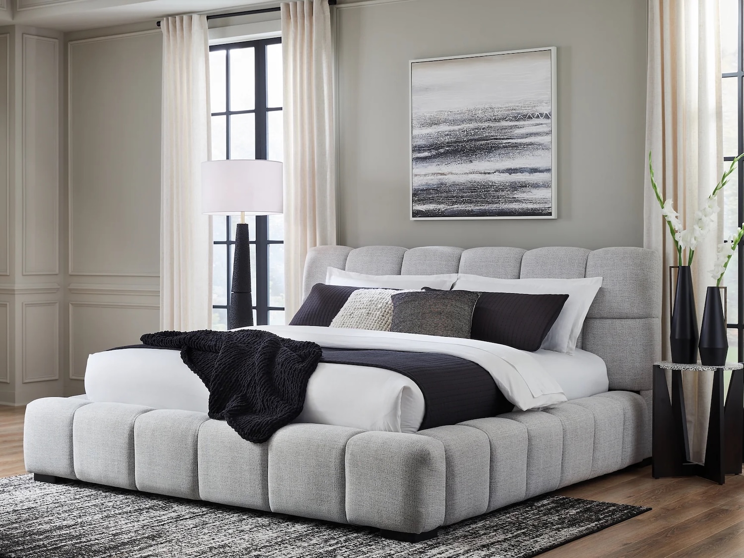 - Includes Queen upholstered headboard, footboard, bunkie board and rails- Foundation features nested bunkie boards with non-woven fabric for a snag-free mattress surface
