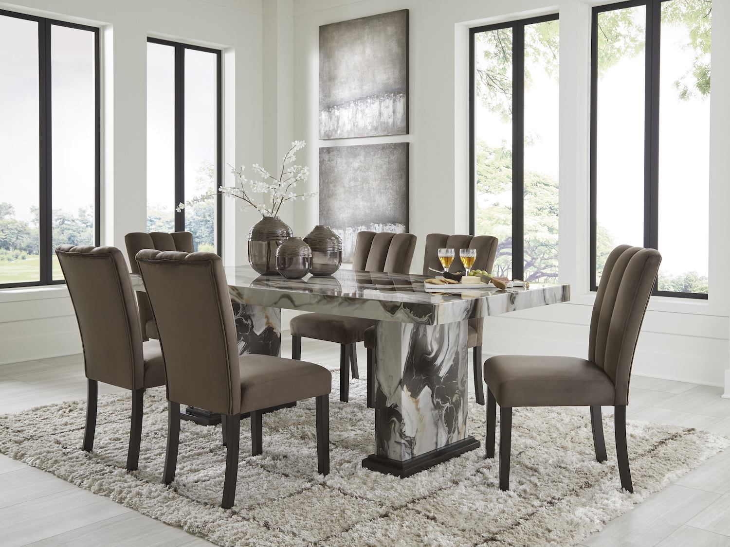 - Chairs features contemporary shape and channeled upholstered details covered in a mocha brown velvet