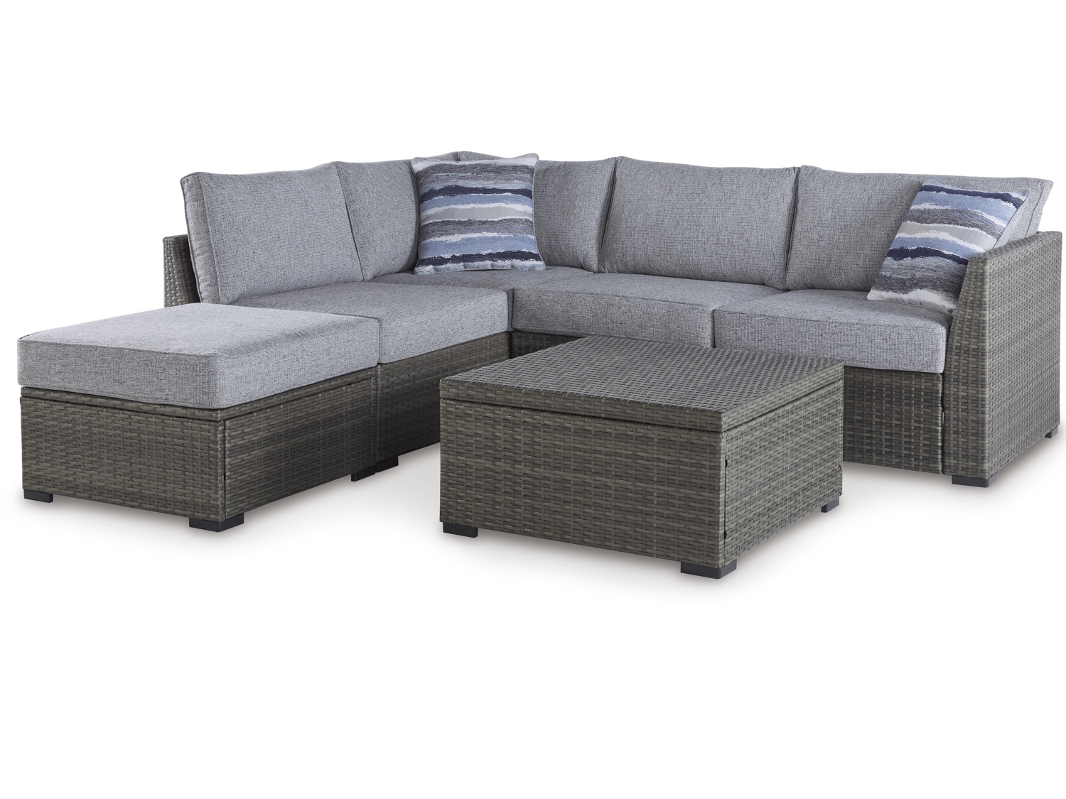 - Includes modular loveseat sectional, ottoman and table- All-weather resin wicker handwoven over rust-free aluminum frame with durable powder coated finish